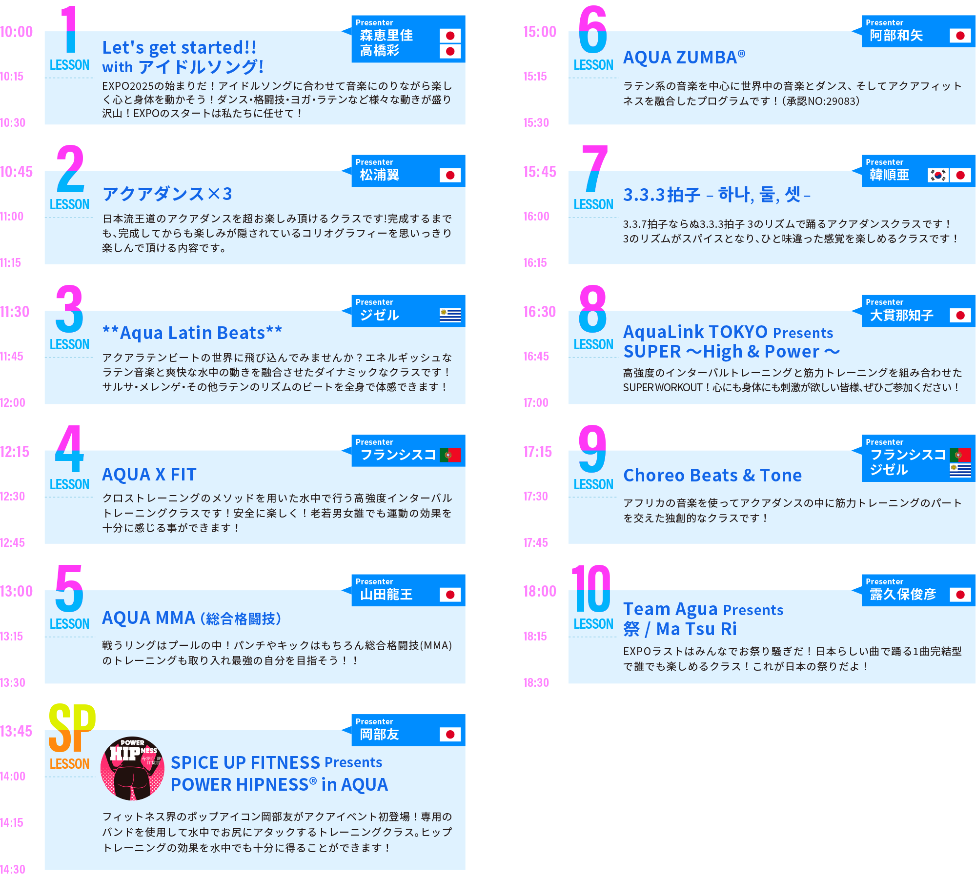 国も年齢も性別も分け隔てなく、よりボーダーレスに、よりグローバルに、そしてより自由な楽しみ方へと進化していくアクアフィットネス。その体験を通じて生まれる、新しい出会いとつながりの輪を広げ、日本から世界へと。新世代が創り出す、フレッシュで無限の可能性あふれる、これからのAQUA FITNESS体験!!
