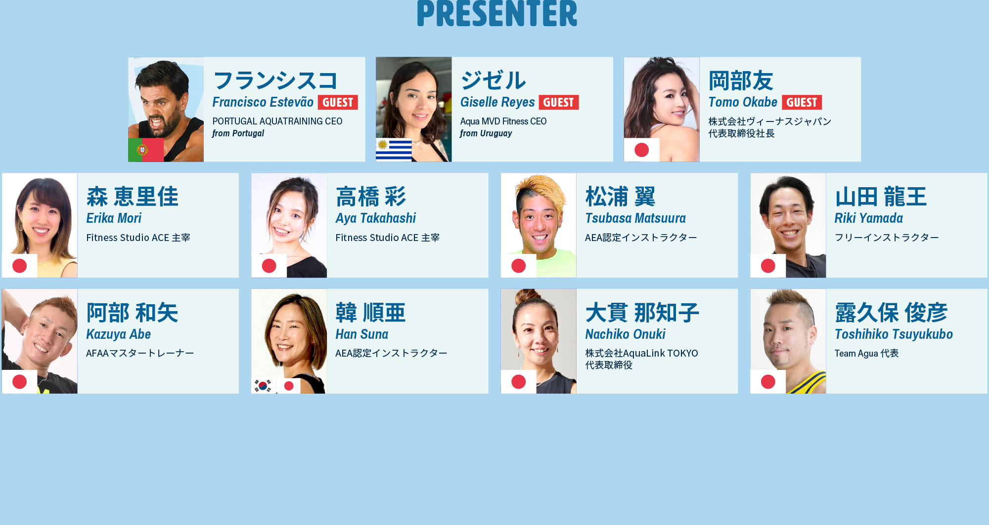 国も年齢も性別も分け隔てなく、よりボーダーレスに、よりグローバルに、そしてより自由な楽しみ方へと進化していくアクアフィットネス。その体験を通じて生まれる、新しい出会いとつながりの輪を広げ、日本から世界へと。新世代が創り出す、フレッシュで無限の可能性あふれる、これからのAQUA FITNESS体験!!